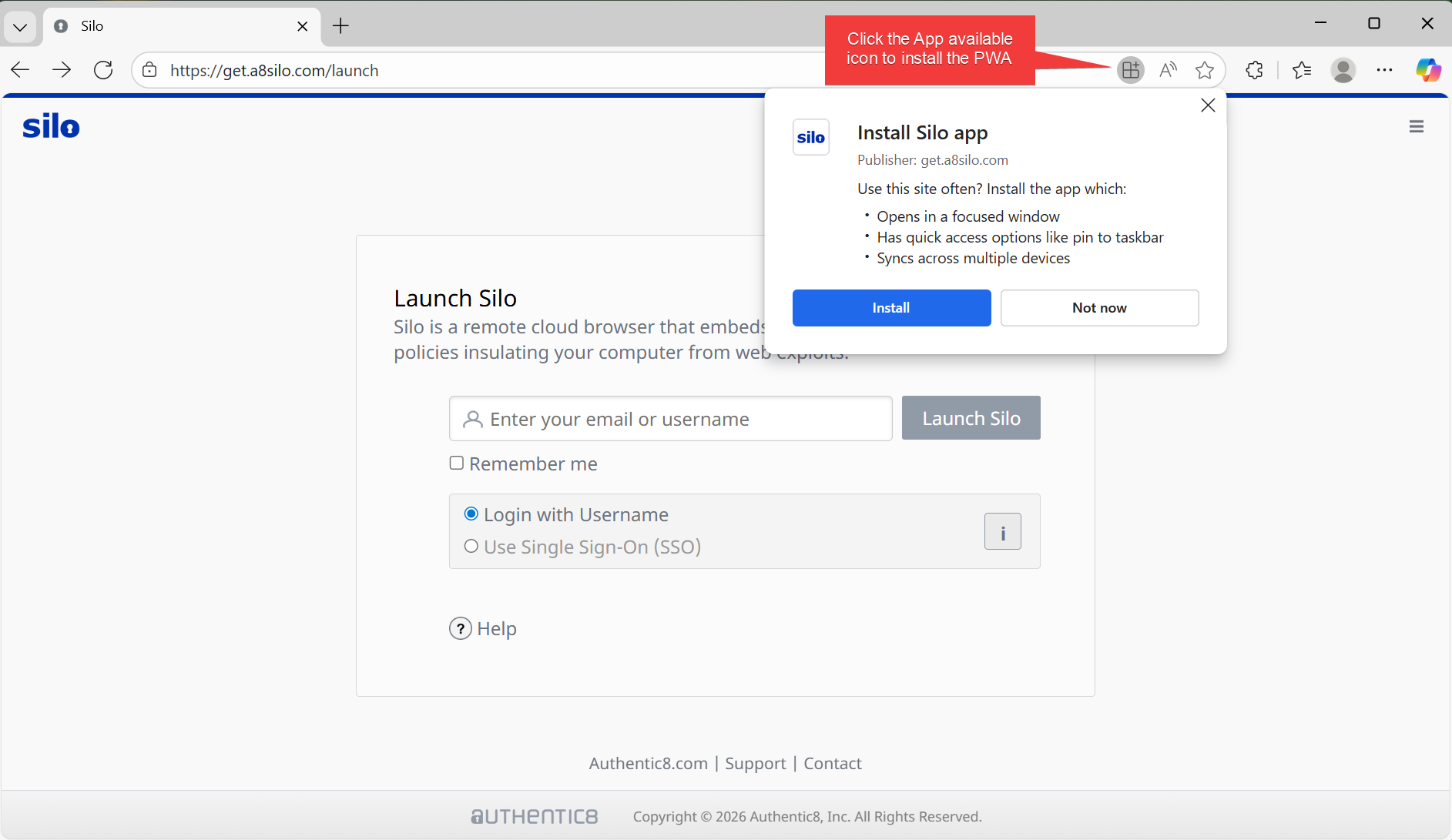 • Please note that a second pop-up window may open if installed from the base URL (get.a8silo.com), but should work on the subsequent installation attempt. To avoid this behavior, make sure to download the PWA directly from the launch page: https://get.a8silo.com/launch